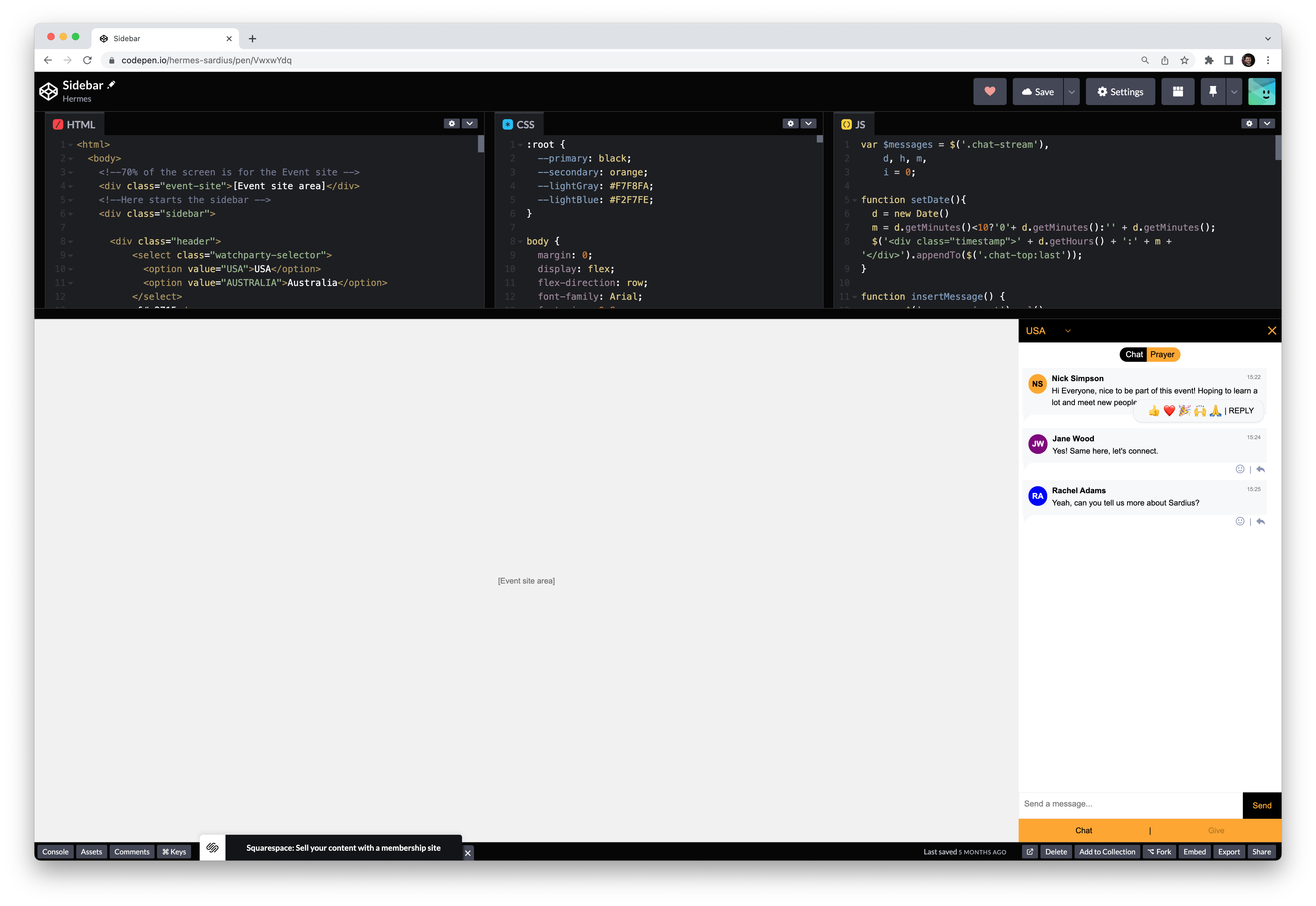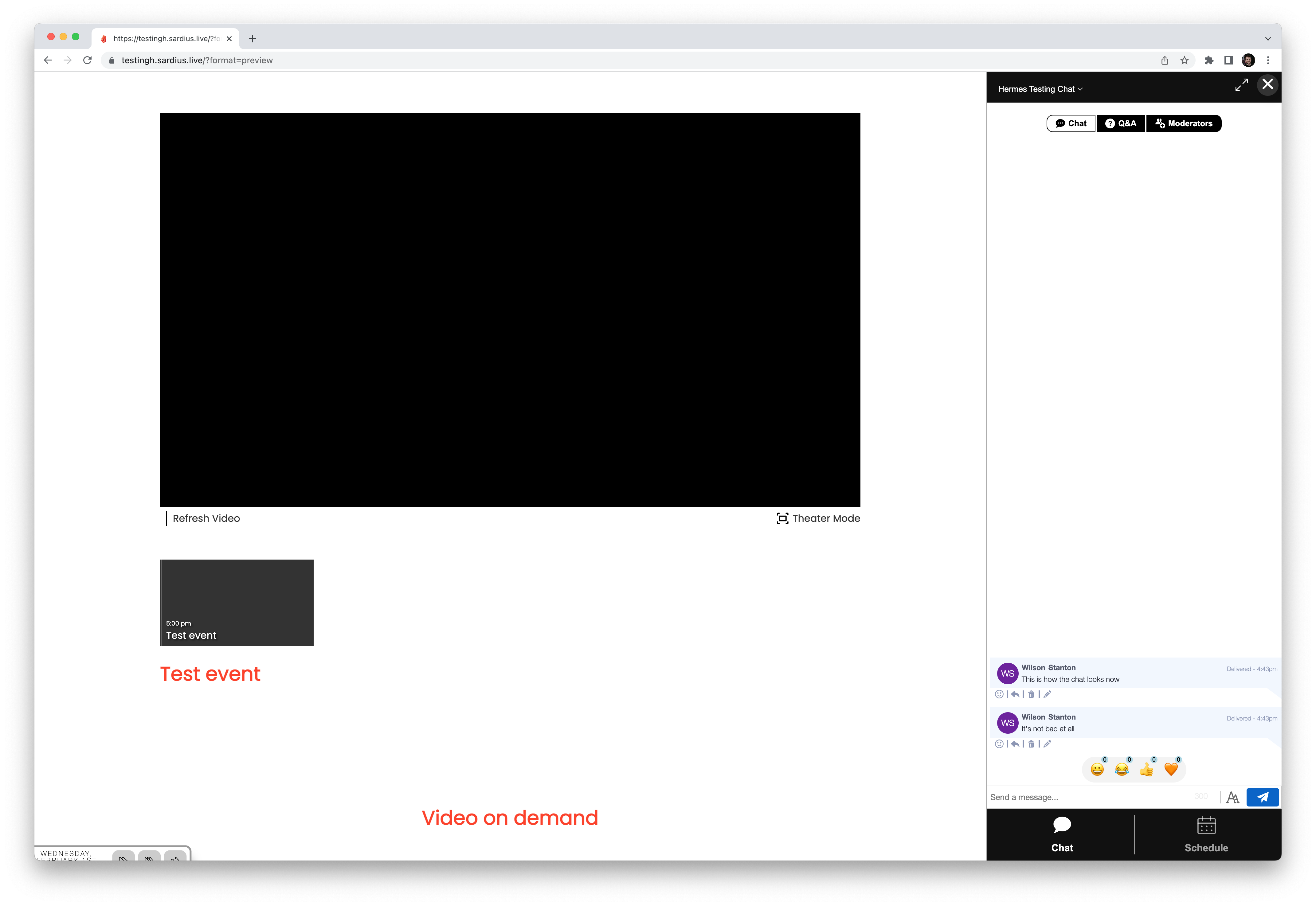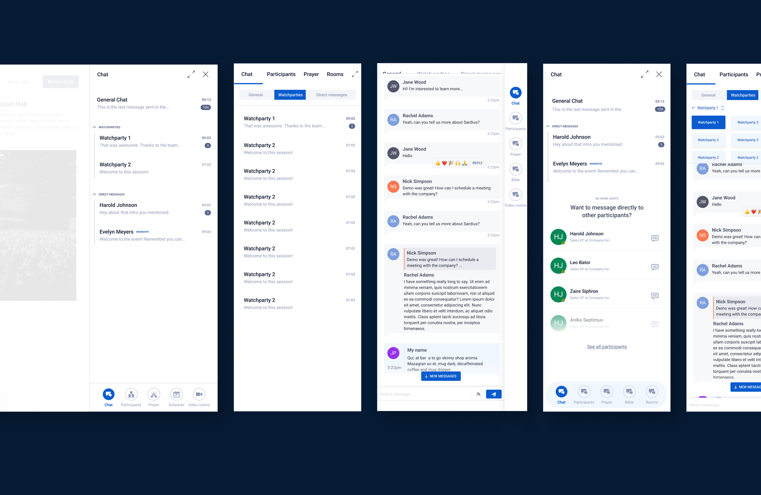 We focused on improving the information architecture of the chat sidebar, ensuring that its features were arranged in a way that made the most sense for our users. The sidebar included a range of functionality, including a Q&A tab, polls, direct messages, video rooms, access to the event schedule, an iframe embed, and the ability to donate to the event. Our goal was to create a user-friendly and intuitive layout that made it easy for people to access and use all of these features.